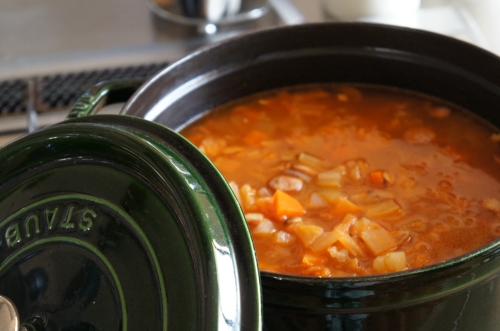 冷蔵庫の余り野菜と常備菜でたっぷり、STAUB鍋で作るミネストローネ。