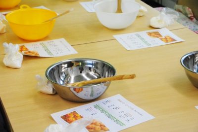 1班1班回りながら、世間話をしたり、先生らしく鶏肉の皮の剥ぎ方や葱のみじん切りの仕方を指導したり。