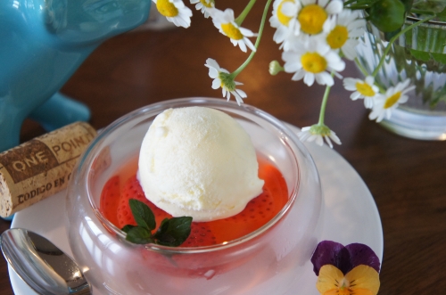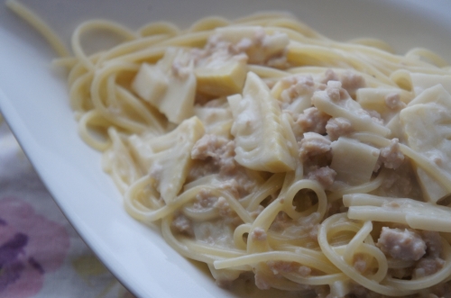 鶏と筍のパスタ れもん風味 いちごのジュレ
