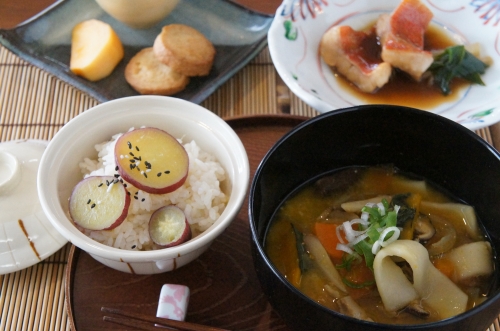 (家庭料理アドバンスクラス10月menu サツマイモ御飯 ほうとう汁 煮魚 生姜クッキー)