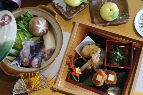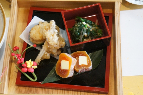 ・鮟鱇鍋 ・セリの茜酢和え(今回はほうれん草とエノキ) ・柿バター ・鮟鱇のから揚げ