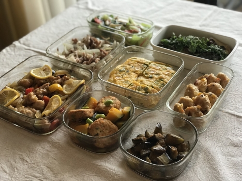 (2021.6 アドバンスクラスレッスンより)青魚の梅煮、青梗菜の煮びたし、オーブンポークオニオン、他 全8品
